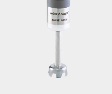 Robot-Coupe Mini MP160V.V. - professzionális felhasználásra tervezett nagykonyhai merülő mixer - rúdmixer, 160 mm szárhosszal, ABS ipari műanyag motorházzal, kisfeszültségű vezérlő gombokkal, fokozatmentes fordulatszám szabályozás: 2000-12500 ford/perc között, motor telj.: 240W/230V; rozsdamentes acél fej és penge, +habosító penge, - szár és fej NEM szétszerelhető. Kisebb mennyiségű alapanyagok feldolgozására ajánlott! Tartozék: fali tartó. # Made in France