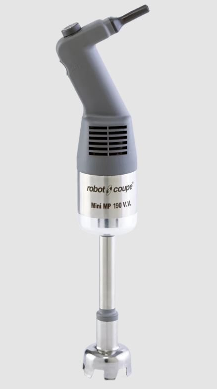 Robot-Coupe Mini MP190V.V. - professzionális felhasználásra tervezett nagykonyhai merülő mixer - rúdmixer 190 mm szárhosszal, ABS ipari műanyag motorházzal, kisfeszültségű vezérlő gombokkal, fokozatmentes fordulatszám szabályozás: 2000-12500 ford/perc között, motor telj.: 270W/230V; rozsdamentes acél fej és penge, +habosító penge, szár és fej NEM szétszerelhető. Kisebb mennyiségű alapanyagok feldolgozására ajánlott! Tartozék: fali tartóval