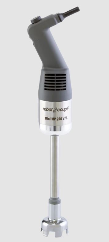 Robot-Coupe Mini MP240V.V. - professzionális felhasználásra tervezett nagykonyhai merülő mixer - rúdmixer 240 mm szárhosszal, ABS ipari műanyag motorházzal, kisfeszültségű vezérlő gombokkal, fokozatmentes fordulatszám szabályozás 2000-12500 ford/perc között, motor telj.: 290W/230V; rozsdamentes acél fej és penge, +habosító penge - szár és fej NEM szétszerelhető. Kisebb mennyiségű alapanyagok feldolgozására ajánlott! Tartozék fali tartóval.