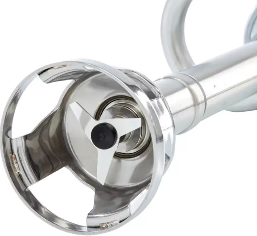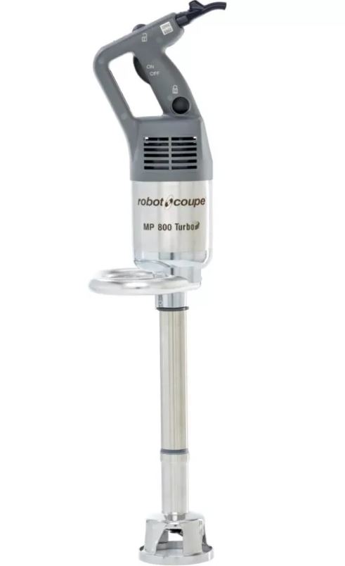 Robot-Coupe MP 800 Turbo TP - professzionális felhasználásra tervezett nagykonyhai merülő mixer - rúdmixer, 350 mm szárhosszal, Kimondottan Billenő serpenyőkhöz optimalizált kialakítás, alkalmas 100 literes, illetve nagyobb méretű serpenyőkhöz, ABS ipari műanyag házzal, kisfeszültségű vezérlő gombokkal, 1 sebesség: 9500 ford/ perc, motor telj.: 1.0kW/230V; rozsdamentes acél fej +penge, szár +fej le +szétszerelhető "EASY PLUG" kábel csatlakozás, LED visszajelző lámpával NAGY mennyiségű alapanyagok feldolgozására ajánlott Tartozék: rm. acél fali tartó.