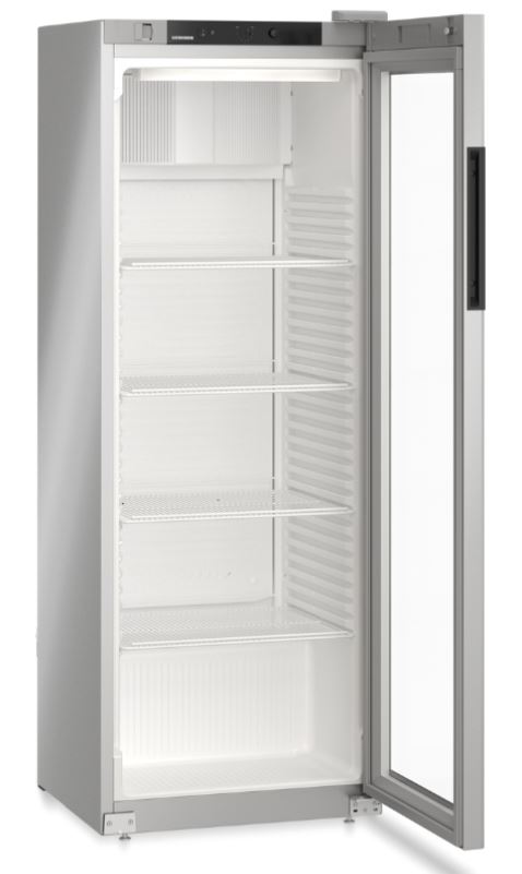 Liebherr MRFvc 3511 Silver – professzionális felhasználásra tervezett és gyártott 347 literes hűtőszekrény; ventilációs hűtési rendszer; zárható HardLine hőszigetelt ÜVEGBETÉTES ajtó (ESG biztonsági üveg), műanyag profil; kapcsolható felső LED világítás; hűtési tartomány: +2/+9°C között; mechanikus vezérlés; analóg hőmérséklet kijelzés; kívül fehér színű porszórt acél burkolat; egy darabból készült, hőformázott polisztirol (környezetbarát) belső burkolat; 4 db fehér színű védőbevonatos megerősített acél rácspolc, STOP funkcióval és leesésgátlóval; a polcok magassága 35 mm-ként állítható; polconkénti terhelhetőség: max. 45 kg; kapacitás: 414 db 0,33l aludoboz, 207 db 0,5l PET, 102 db 1l PET, 80 db 1,5l PET palack (facing: 7); az ajtó önműködően csukódik (90°-tól nyitva marad) és nyitásának iránya megfordítható; higiénikus, cserélhető ajtószigetelés; ajtóprofilba süllyesztett fogantyú; automatikus leolvasztás; 1 pár első vízszintező talp; FCKW-FKW mentes hűtőközeg (R 600a) és falszigetelés (50 mm); külső hőmérséklet: +10/+40°C között - CC2 klímaosztály; éves energiafelhasználás: 538,20 kWh; C energia hatékonysági osztály. FONTOS: Az akciós ár megrendeléskor történő 100% előrefizetés esetén érvényes!