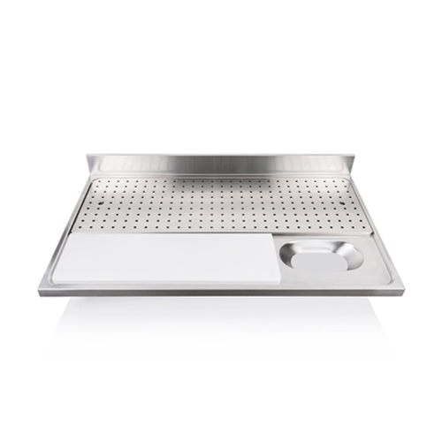 PG Art - HÚS előkészítő és mosó munkalap, vágólappal és ledobóval kombinálva, professzionális nagykonyhai felhasználásra, rm acél fedlap, Mélyhúzással gyártott, 100 mm magas és 15 mm vastag hátsó fali felhajtás, 40 mm magas elülső és oldalsó lehajtás, ledobó nyílással, perforált betéttel, polietilén vágólappal, csak fali zuhany és csaptelep kiépítése megoldható, LÁBAK és FALI konzolok nélkül! FELÁR ellenében falra konzolosan rögzíthető, illetve műhelyben rm. acél 40*40 mm-es lábakra állítható - ezekre kérjen ajánlatot!, anyaga: rozsdamentes acél, származási hely: Olaszország. FONTOS: a feltüntetett ár, az üzletben történő átvétel esetén érvényes!