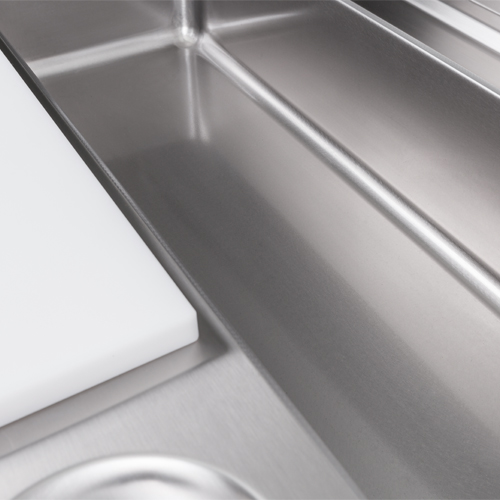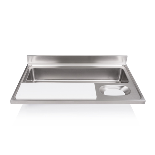 PG Art - ZÖLDSÉG és gyümölcs előkészítő és mosó munkalap, 1070*310 mm előmosó medencével, vágólappal és ledobóval kombinálva, professzionális nagykonyhai felhasználásra, rm acél fedlap, Mélyhúzással gyártott, 100 mm magas és 15 mm vastag hátsó fali felhajtás, 40 mm magas elülső és oldalsó lehajtás, ledobó nyílással, mosó medencével, polietilén vágólappal, (csak fali zuhany és csaptelep kiépítése megoldható) LÁBAK és FALI konzolok nélkül! FELÁR ellenében falra konzolosan rögzíthető, illetve műhelyben rm. acél 40*40 mm-es lábakra állítható - ezekre kérjen ajánlatot!, anyaga: rozsdamentes acél, származási hely: Olaszország. FONTOS: a feltüntetett ár, az üzletben történő átvétel esetén érvényes!