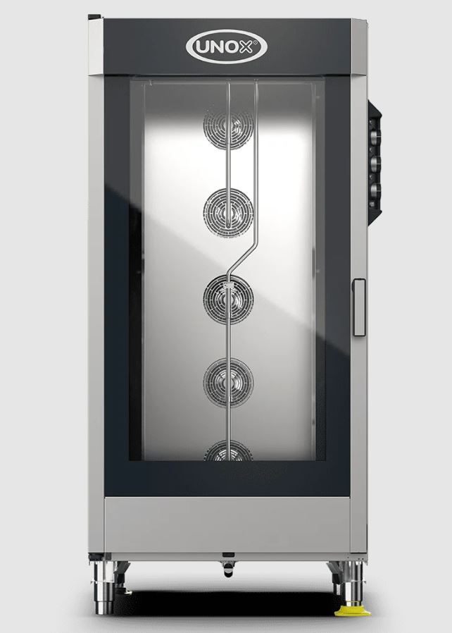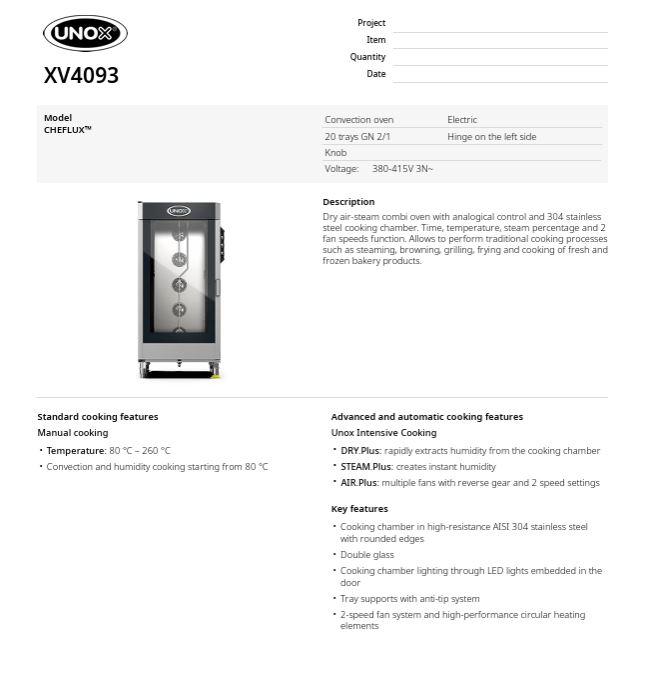 UNOX ChefLux XV4093 Manual - elektromos légkeveréses gasztronómiai sütő-pároló kemence, 20 db GN2/1 tálca kapacitással, tálca távolság 66 mm. Tartozék: 1 db UNOX.QUICK Load tálca kocsi, 20*GN2/1 tálca kapacitással; Elektro mechanikus vezérlés, manuális forgató gombos állítás, hőm.tart.: +30/+260°C között, párásított sütés: +48/+260°C között szabályozható. Előmelegítési hőmérséklet max: 260°C -ig állítható. 2 fokozatú ventiláció sebesség, AIR.Plus™ automatikusan 2 percenként irányt váltó légkeverés az egyenletes sütés érdekében. STEAM.Plus™ 0-100% között 5 lépcsőben állítható páratartalom szabályozás DryPlus™ szabadalmaztatott pára kiszellőztetés funkció, Protek.SAFE™ - 2 rétegű ajtó üvegezés, hideg külső üveg felület a biztonságért. LED sütőtér világítás a két üveg között, a program végét csengő hang jelzi. Ajtó nyitás: jobbról - balra. FONTOS: a készülék szakszerű beüzemelést igényel, - a feltüntetett ár a beüzemelést NEM tartalmazza, kérje szakszerviz közreműködését! nettó tömeg 225 kg.