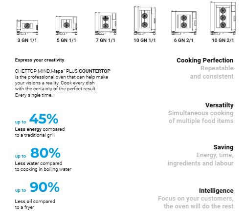 UNOX ChefTop MIND.Maps™ Plus - XEVC-0621-EPRM Plus elektromos üzemű gasztronómiai kombi gőzpároló-sütő sütő, 6*GN2/1 tálca kapacitás, 67 mm tálca távolság. Beépített ötpontos maghőmérő szonda DELTA T alkalmazás, előfűtés: +260°C-ig; sütés: +30/+260ºC között, párás sütés: +48/+260ºC között állítható. Ajtókeretbe épített 7”-os Master Touch Plus gőzálló érintő képernyős vezérlés. AIR.Maxi™ technológia biztosítja az egyenletes légkeverést, hőmérséklet elosztást, automatikus forgásirány váltással, PULSE funkcióval. STEAM.Maxi™ gyors párásítás funkció, DRY.Maxi gyors sütőtér kiszellőztetés és párátlanítás funkció, CLIMALUX™ komplett páratartalom kezelés a sütőtérben. MIND.Maps™ technológia segítségével, komplett sütési program egyetlen érintéssel elvégezhető. ADAPTIVE.Cooking™ az intelligens sütési képesség, MISE.EN.PLACE technológia, hogy különböző ételek egyszerre készüljenek el, MULTI.Time program, akár 10 különböző termék is készíthető egyszerre a sütő tájékoztat ezek állapotáról. Sütési módok: manuális sütés, programozott sütés, 4 fokozatban állítható ventiláció, plusz 4 fél statikus mód, 0-100 % között állítható párolás. A gyári beállításokon kívül, több mint 1000 egyéni sütési paraméter menthető képekkel, MAGYAR nyelven!