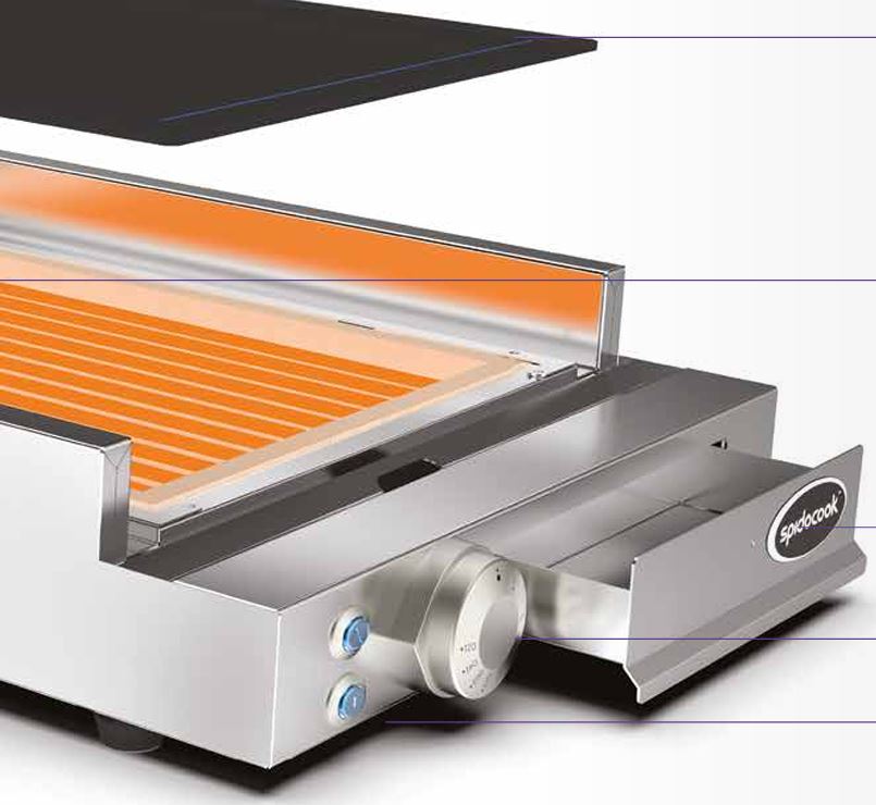 SPIDOFLAT™ SP200 Manual – professzionális 1 ZÓNÁS GRILL-LAP, lapsütő üveg kerámia sütő-felülettel, sütőfelület: 1*280*440 mm, FEKETE üveg grill lappal, állítható MANUÁLIS vezérlés +120/+400ºC között állítható termosztáttal, kivehető, könnyen tisztítható zsiradék gyűjtő fiókkal, rozsdamentes acél készülék váz 4 db csúszásmentes talppal, ON/OFF - KI/BE kapcsoló és LED hő visszajelző gombbal, tartozék - fém felület tisztító kaparó. Kiválóan alkalmas: toast, sandwich, hús, zöldség, tojás hal, seafood, ételek kiváló minőségben történő gyors sütésére, valamint grillezésére, a teljesen sima üvegkerámia felületen. csomag: 450*700*170 mm; tömeg: 12.5 kg.