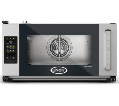 UNOX BakerLux SHOP.Pro™ XEFR-03EU-ETRV Elena.MATIC TOUCH - látványsütő kemence, elektromos légkeveréses, 3 db 600*400 mm tálca kapacitás. JOBBRÓL - BALRA oldalra nyíló ajtó, tálca távolság: 75 mm, sütési hőm.: +30/+260°C között állítható, párásított sütés: +48/+260°C között több lépcsőben 20-40-60-100% között választható, előmelegítés: +260°C-ig. Elektronikus vezérlés, Ajtóba keretbe épített 2.4"-os LCD érintő kijelzős kezelés - párásítás funkció, - szükséges vízcsatlakozás előkészítése, vezérlő paneljén keresztül a TOUCH modell képes BakerLux SHOP.Pro™ kelesztő szekrényt vezérelni, amely készülék állványként is szolgálhat! Ventless és Waterless ernyő csatlakoztatható hozzá. Sütőtér belső LED világítással, Idő és hőfok beállítási lehetőség, 9 lépésre osztható sütési ciklus, 2 percenként automatikus irányt váltó légkeverés, 12 gyors program, 99 db felhasználói program, melyhez akár nevet és képeket rendelhetünk! Programozható okos telefonról vagy tablet-ről is!
