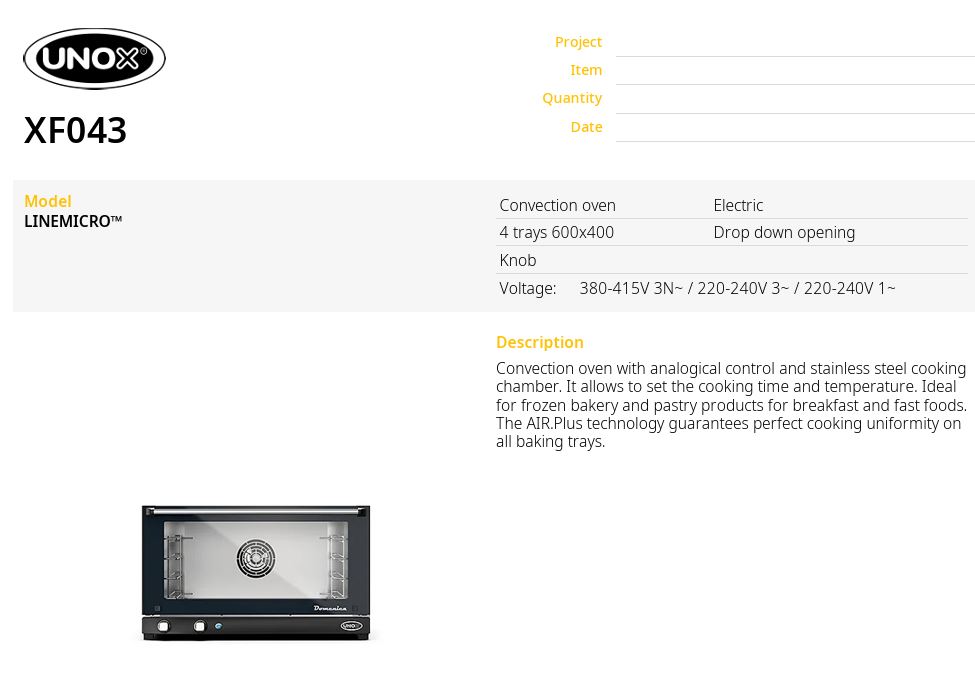 UNOX XF013 LineMicro™ Lisa Manual – elektromos üzemű, légkeveréses látvány sütőkemence MANUÁLIS vezérléssel, 3*460*330 mm tálca/rács kapacitás, 75 mm-es távolság, előfűtési hőm.: +30/+260°C; sütési hőm.: +30/+260ºC között állítható. Egyszerű kialakítás, többletfunkciók és ventilátor forgás irány váltás NÉLKÜL, AIR.PLus™ légkeverés gondoskodik a tálcánkénti egyenletes sütésről! Elektromechanikus vezérléssel, idő és hőfok beállítása az ajtó alatti forgató gombokkal. PROTEK.Safe™ - dupla üvegezésű ajtó, belső üvege energia hatékonysági és biztonsági okokból fóliázott, üvegek között LED sütőtér világítás, az ajtó lefelé nyílik!