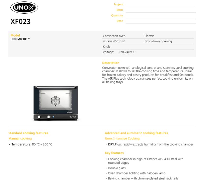 UNOX LineMicro Manual XF023 Anna - elektromos üzemű, légkeveréses látvány sütőkemence MANUÁLIS vezérléssel, 4*460*330 mm tepsi kapacitás, 75 mm tálca távolság. Előfűtési hőm: +30/+260°C; sütési hőm: +30/+260ºC között állítható. Egyszerű kialakítás, könnyű kezelhetőség, többletfunkciók és ventilátor forgás irány váltás NÉLKÜL! Elektro- mechanikus vezérlés, az idő és hőfok beállítása az ajtó alatt elhelyezett forgató gombokkal történik, PROTEK.Safe - dupla üvegezésű ajtón a belső üveg energia takarékossági és munka biztonsági okokból hővisszaverő fóliázott, üvegek között LED sütőtér világítás - ajtaja felülről lefelé nyílik!