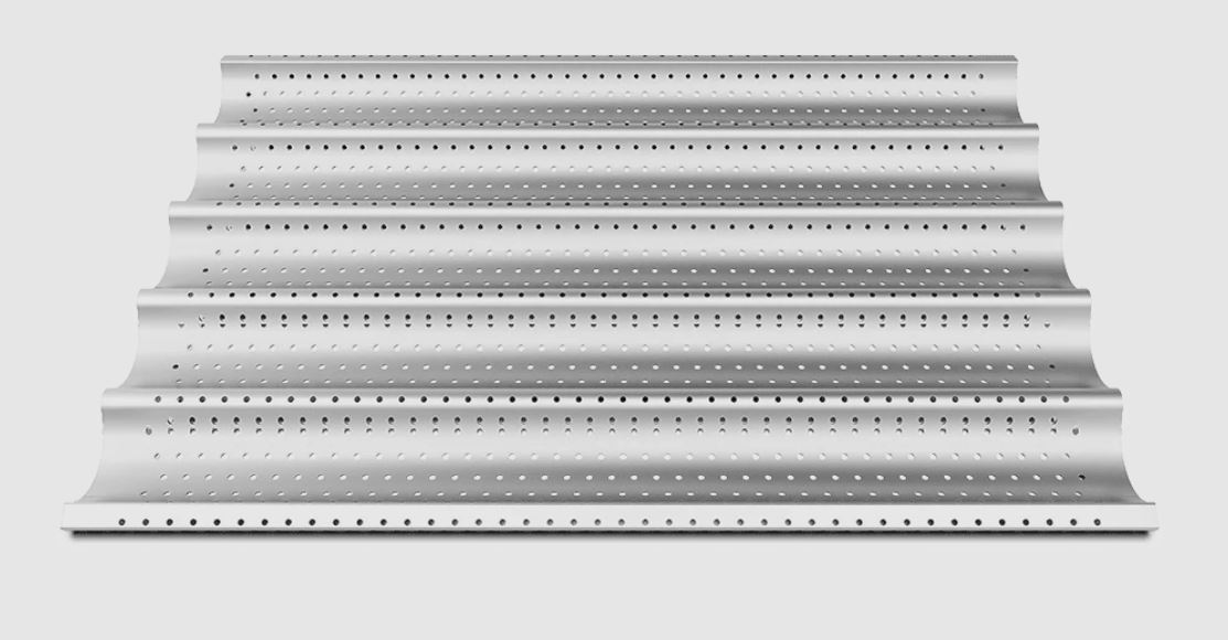 UNOX TG445 - FORO.Baguette perforált alumínium speciális sütő tepsi, a (800-as szériájú) 80 cm külső szélességű látvány sütő kemencékkel kompatibilis, a tepsi külső mérete: 600*410 mm, magassága 15 mm, sütőfelülete perforált 5 HULLÁMOS, ami miatt első sorban BAGUETTE sütésre ajánlott